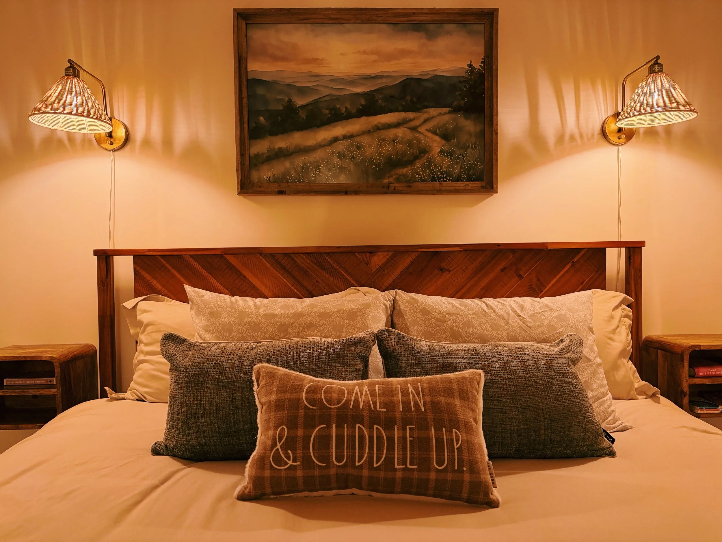 Our BnBs are the perfect places to relax with your people, enjoy nature, and just BE. We've put much attention to detail in designing the cozy spaces, including cloud-like comfy beds with luxury linens, natural textures and soothing colors, quality furniture, and materials that echo our surroundings in the Tennessee countryside. 🌿